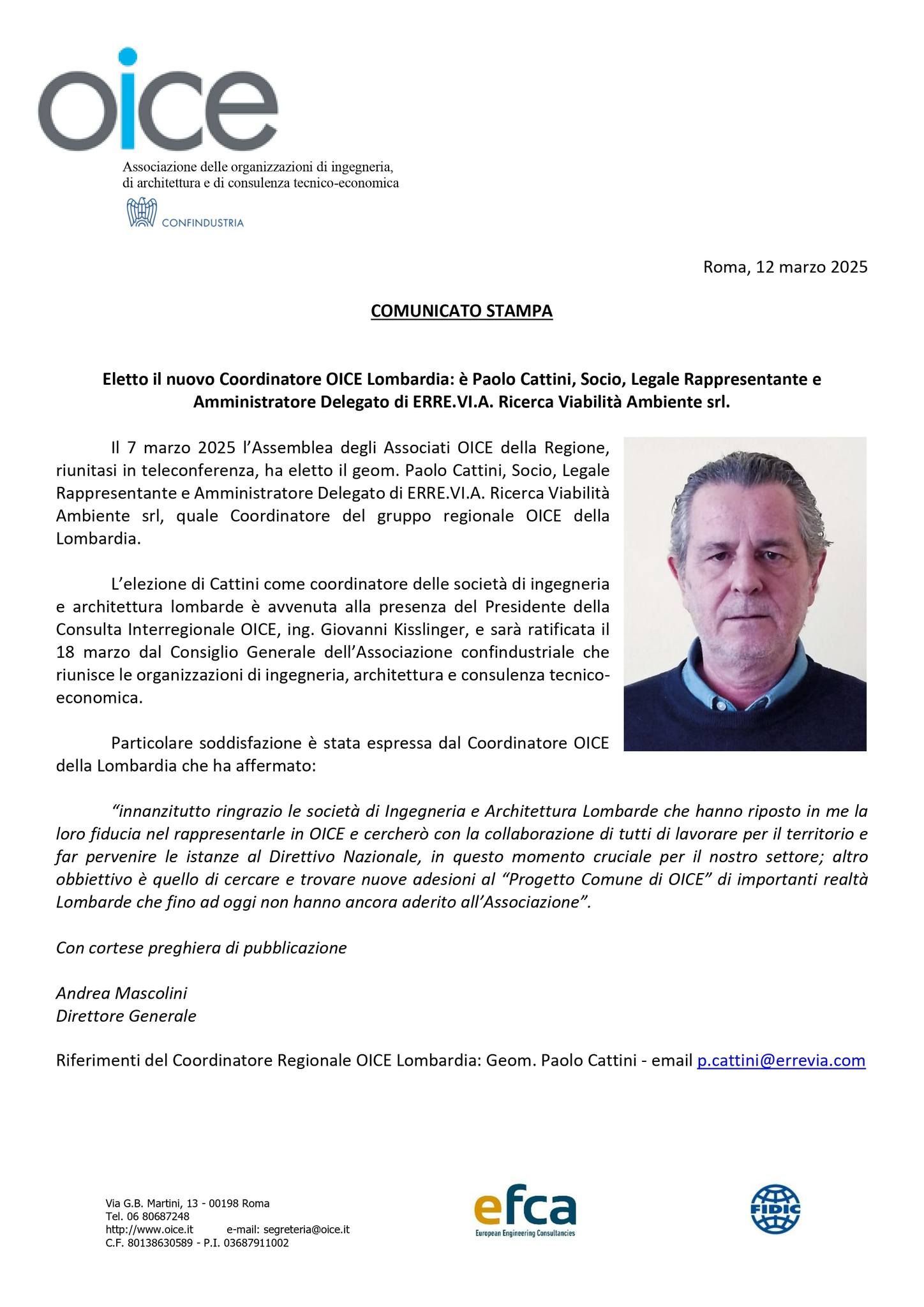 Il team tutto di Erre.Vi.A. fa le sue personali congratulazioni e in bocca al lupo per l'elezione - quale Coordinatore del gruppo regionale OICE della Lombardia - al geom. Paolo Cattini, Socio, Legale Rappresentante e Amministratore Delegato di Erre.Vi.A., certi che cercherà "la collaborazione di tutti al fine di lavorare per il territorio".