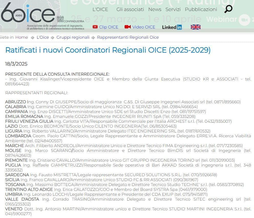 L'elezione da parte dell'Assemblea degli Associati OICE di Regione Lombardia e alla presenza del Presidente della Consulta Interregionale OICE, ing. Giovanni Kisslinger, è avvenuta in data 7 marzo 2025 e ratificata il 18 marzo dal Consiglio Generale dell’Associazione confindustriale che riunisce le organizzazioni di ingegneria, architettura e consulenza tecnico-economica.